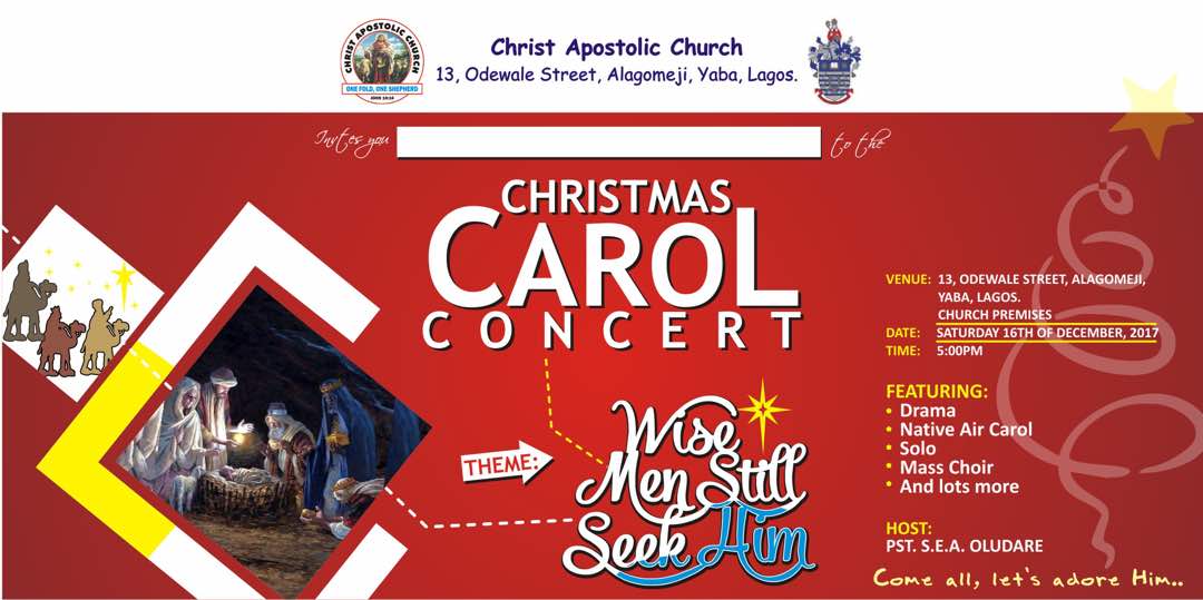 In a bid to commemorate the birth of our Lord Jesus Christ, Christ Apostolic Church, Yaba Districts Coordinating Council, Yaba Lagos will today Saturday 16th December 2017 hold a Christmas Carol Concert.